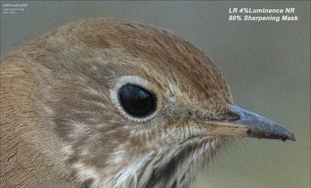 For me, I've used Imagenomic's Noiseware noise reduction software for years and have been very happy with it. My workflow typically involves applying initial Luminance Noise reduction (4-10%) in Lightroom Classic followed by an 80% Sharpening Mask. Here is a Hermit Thrush portrait expanded to 300% and shot at ISO 6400 before and after applying the manual noise reduction in Lightroom Classic: